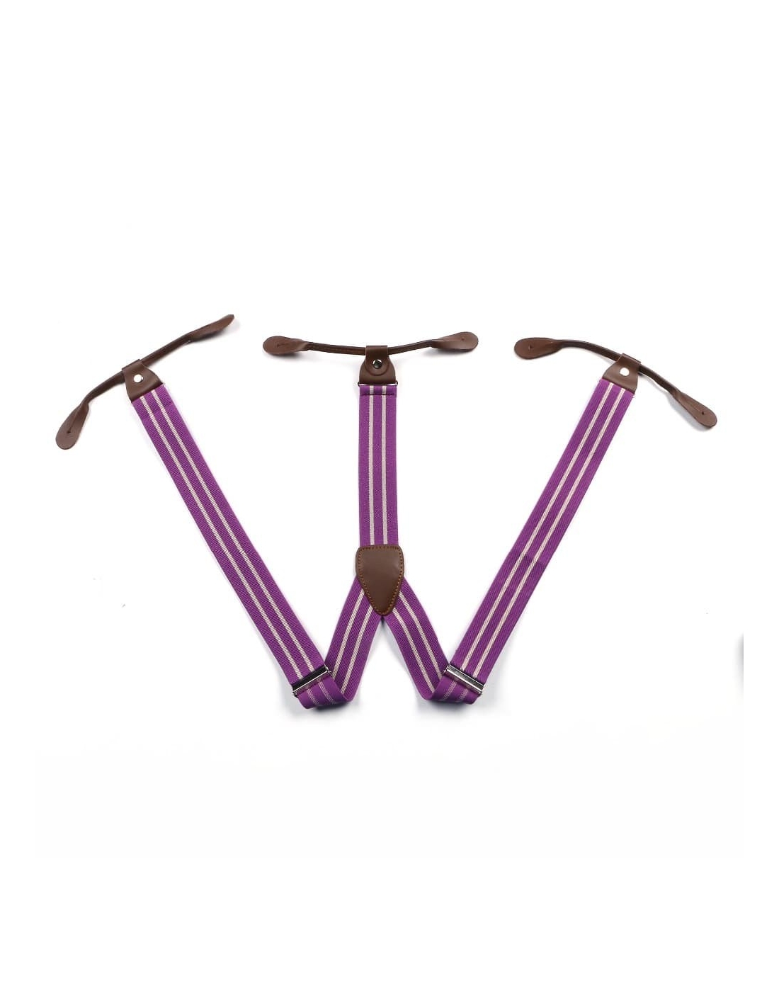 bretelles violettes rayures Les bretelles, dont le but initial était de maintenir les pantalons, sont devenues des accessoires de mode. Elles sont élastiques et croisées dans le dos. Les dandys les préfèrent toujours authentiques, directement fixées au pantalon par un système de boutons. Il est aussi possible d'opter pour un système de pinces. Bretelles violettes rayures Les bretelles, popularisées en France à la révolution, elles voient leur essor s'affirmer en 1800 avec la conception industrielle de bretelles élastiques par Charles Antheaume. Le type moderne a été inventé en 1822 par Albert Thurston avec des attaches boutons et clips. En raison du port de pantalons à taille haute rendant la ceinture peu pratique, leur usage était presque universel depuis le milieu du XIXe siècle et le début du XXe siècle. Jusqu'en 1830 coexistait en France la « bretelle ouvrière », formée de deux lisières en drap, avec une boutonnière à chaque extrémité, et la « bretelle bourgeoise », faite d'étoffes superposées ou de cuir, dont la souplesse était assurée par de petits ressorts à boudin puis par des fils de caoutchouc importés d'Angleterre. Elles perdent leur popularité durant la Première Guerre mondiale, les hommes étant habitués aux ceintures uniformes, mais restent encore la norme dans les années 1920. En raison de leur image en tant que sous-vêtements, les hommes passent à la mode de la ceinture dans les années 1930, parallèlement à la perte de l'usage du gilet qui cachait le port des bretelles. Cela annonce également le passage de la position des boutons de l'extérieur de la ceinture à l'intérieur. Costume Privé Paris propose une collection de bretelles de couleur pour un esprit original lors d'un évènement ou une soirée.