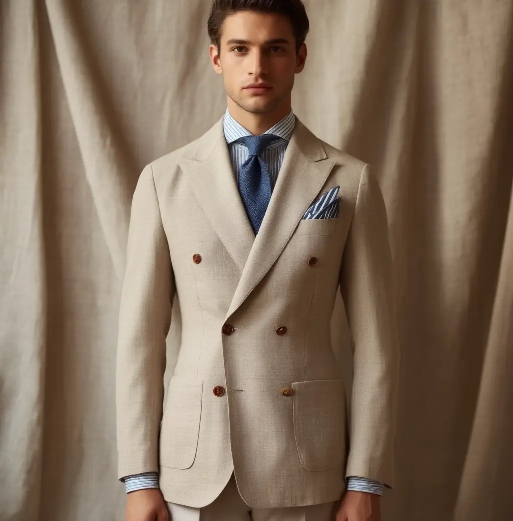 Blazer croisé Beige Sable clair, blazer tendance, blazer croisé sur mesure : une pièce forte, lumineuse et élégante, pensée pour l’homme qui veut signer son style avec subtilité.