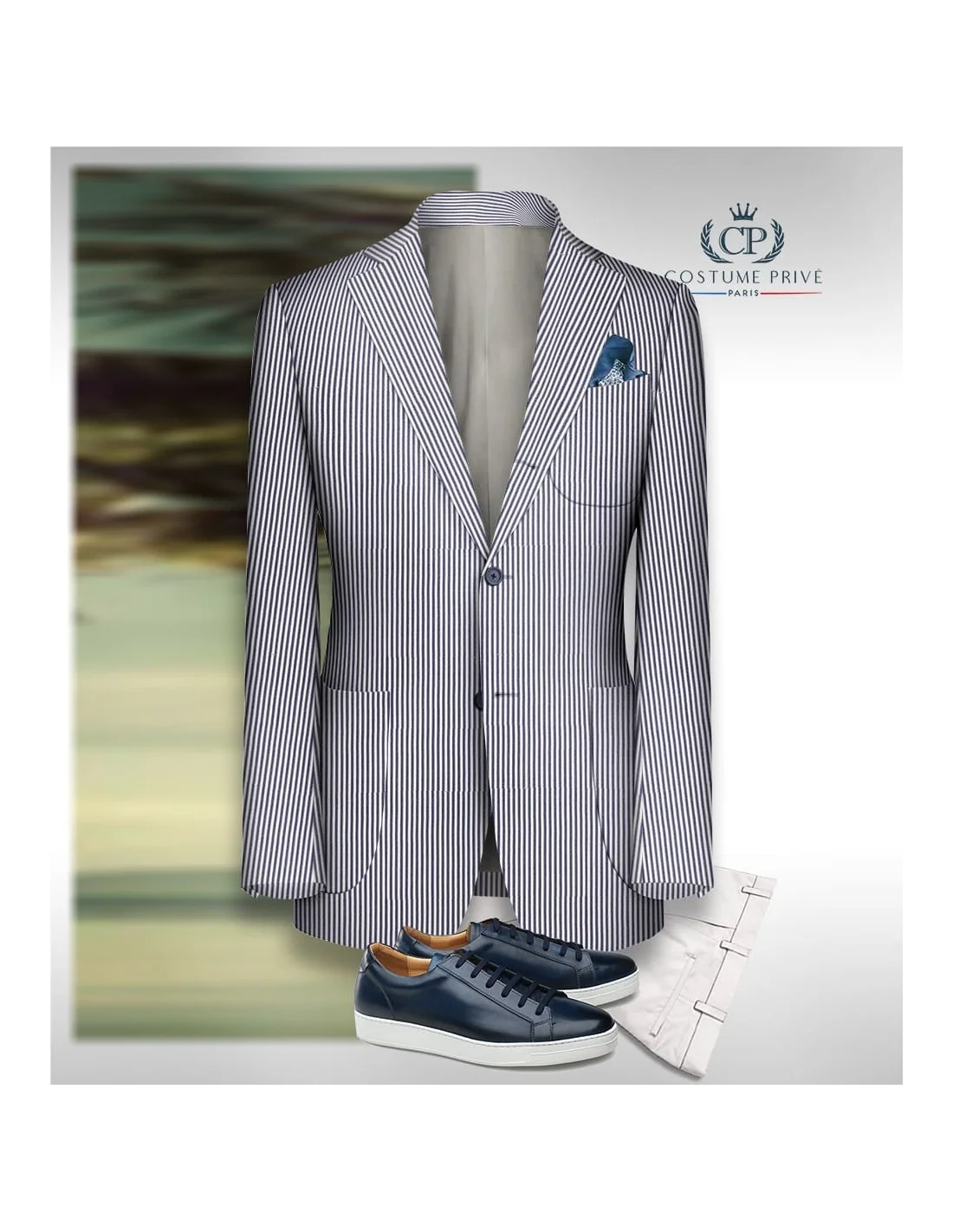 Pour ce blazer seersucker est un grand classique du style casual estival. En garden party comme en mode riviera il vous apporte un style inimitable. Tissu coton pour apporter fraicheur et décontraction. 2 boutons, Coupe droite, revers à cran, 3 poches appliquées. Sneakers personnalisés patinés main 220€ sur demande.