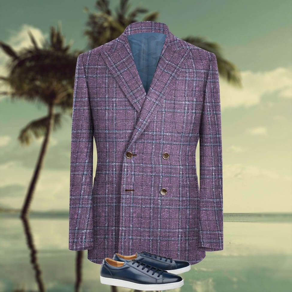 Veste croisée violet carreaux été pour un style audacieux italien Tissu pure mélange laine lin Solbiati 4 boutons Coupe croisée, col revers à cran pointu, 3 poches appliquées Sneakers personnalisés patinés main 220€ sur demande.