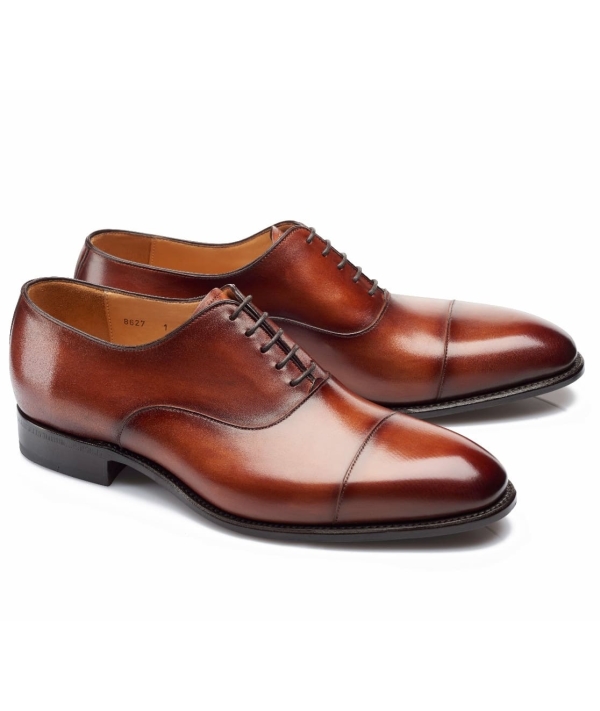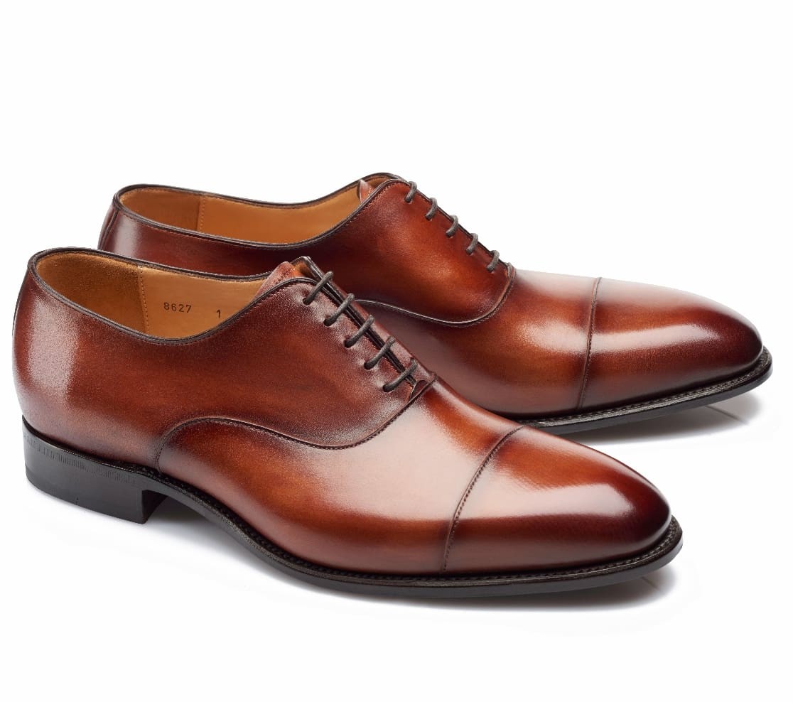 Chaussures Richelieu bout droit cognac patiné : Un classique inoubliable et riche en élégance capable de s'assortir sans effort avec un look sophistiqué. Les chaussures Harold de Carlos Santos Shoes possèdent un design simple et épuré, conçues selon la méthode artisanale de confection Goodyear Welted. Les chaussures Cap Toe disponibles dans les couleurs Bosco, Braga, Coimbra, Noir Shadow, Wine Shadow et Norte. Pour un style plus décontracté et moins classique, nous vous proposons aussi des baskets en cuir patiné. Avec les frontières entre la vie sociale et la vie professionnelle qui s'estompent de plus en plus, les baskets en cuir peuvent être le choix idéal pour les hommes de tous les jours. Décontractées et avec une touche d'élégance, elles se trouvent disponibles dans des couleurs intenses telles que Marron, Vert, Bleu, Bordeaux, Cognac. Les patines personnalisées leur apportent un supplément d'âme, d'élégance, de chic, qui les distinguent des simples baskets blanches attribut classique de l'univers de la pub ou de la création. Entretien Chaussures Richelieu bout droit cognac patiné : Prenez soin de vos chaussures en cuir, en utilisant une cire ou une crème appropriée pour couvrir toute leur surface. Avec un chiffon en coton, essuyez délicatement pour retirer l'excédent de produit. Baskets cuir bordeaux patiné