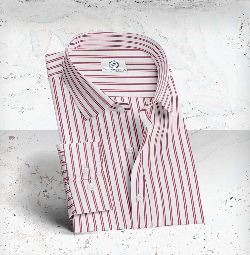 Chemise blanche avec double rayure rouge Tissu Thomas Mason Personnalisez votre chemise sur-mesure : 25 cols 8 poignets 9 modèles de poche Broderie Boutons Surpicures ...
