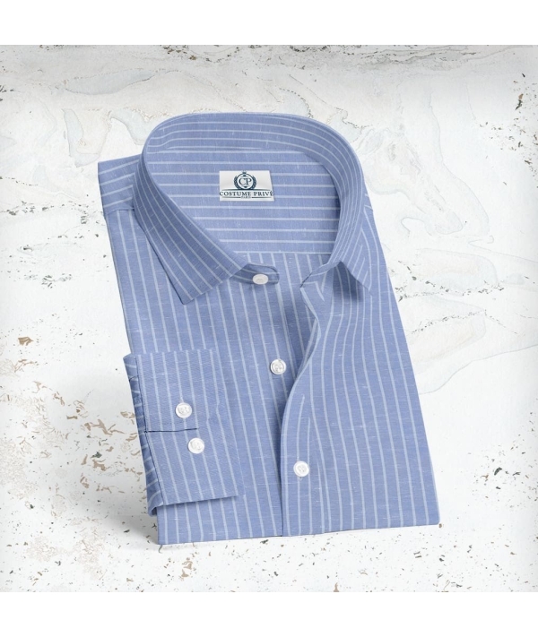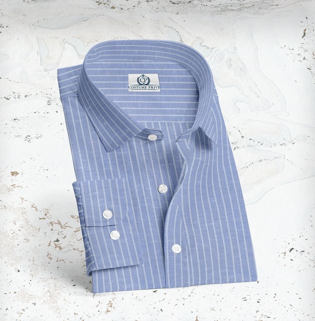 Chemise Bleu rayures Coton Lin sur mesure confectionnées à l’aide des meilleurs tissus italiens, selon la grande tradition de confection. Qualité, luxe et une longue tradition. La marque anglaise Thomas Mason naît en 1796, en pleine révolution industrielle, lorsque sir Thomas Mason, devinant les potentialités de cette période, crée à Leeds l’une des premières usines de tissus en coton pour chemises. Depuis lors, les tissus Thomas Mason sont une référence pour les passionnés du goût britannique et pour les amateurs des fils les plus fins, tirés des lins et des cotons les plus précieux au monde. Après deux cent ans de succès, en 1992, Thomas Mason est rachetée par la famille Albini de Bergame et elle intègre alors la grande tradition textile italienne. Découvrez nos collections En ce qui concerne la confection, nous avons plusieurs ateliers en fonction de votre recherche de style, de finitions, de budget et de délai. Nous vous conseillerons pour que vous ayez une chemise qui corresponde à vos souhaits. Nous travaillons avec les meilleurs artisans français, italiens ou d'Europe de l'Est.Le sur-mesure vous offre la possibilité de jouer avec tous ces paramètres. Cette Chemise Bleu rayures Coton Lin est entièrement personnalisable. Toutes les possibilités de finitions que nous vous proposons n'ont qu'un objectif : que votre vêtement corresponde à 100% à votre style, à votre image et à votre façon de vivre. Votre conseiller-tailleur vous accompagne pour vous permettre de concrétiser votre vêtement. Costume Privé Paris vous propose un service tailleur de réalisation de costumes sur-mesure digne des grandes maisons de luxe. Associant une qualité remarquable des tissus, une fabrication respectueuse de la tradition, un conseil passionné et exigeant et enfin une service personnalisé qui vous fait changer votre perception du shopping. Le sur-mesure est avant tout un art de vivre, c'est notre philosophie. La qualité remarquable des tissus est garantie par la collaboration avec les plus grands drapiers internationaux tels Loro Piana, Holland & Sherry, Scabal et Dormeuil. La confection n'est pas en reste. A quoi servirait l'avoir une Ferrari sur le châssis d'une Simca? L'atelier a été sélectionné avec soin pour garantir la meilleure tenue de votre vêtement sur-mesure dans le temps et le respect des délais de production. Cet atelier confectionne des marques prestigieuses, telles que Givenchy, Kenzo et Dormeuil Sur-Mesure. Le type de montage que j'ai retenu pour les collections business est un montage semi-traditionnel. Il respecte le savoir-faire et est un très bon compromis entre excellente tenue et cout raisonnable. Pour les puristes, il est aussi possible de choisir un entoilage total, ou alors un style casual sans entoilage pour des blazers-chemises très italiens. La coupe est enfin un critère clé pour votre style. Je n'ai pas de dictat car chacune fait du sens en fonction de votre morphologie et de l'esprit que vous voulez transmettre. Qu'elle soit anglaise, romaine ou napolitaine, votre épaule s'inscrit dans votre personnalité. Au même titre que l'ajustement d'une taille, d'une manche ou d'une cuisse. Que le choix du type de padding pour votre épaulette. Si vous avez des exigences particulières, je serai ravi de m'y conformer. Enfin le service d'exception qui vous fait oublier que vous faites du shopping. Vous êtes très occupés, les déplacements dans Paris sont fastidieux, le week-end vous avez mieux à faire que courir les boutiques. Nous venons à vous. Au bureau ou à domicile, nous nous déplaçons pour que vous sélectionniez vos tissus, pour prendre vos mesures ou pour réaliser votre essayage. Nous vous livrons vos vêtements sur le lieu de votre choix. Vous n'avez pas la possibilité de nous accueillir, rencontrons nous dans l'un de nos showrooms parisiens. Vous ne savez pas où faire entretenir vos costumes? Grâce à notre Groom Service, nous passons récupérer vos vêtements. 3 jours plus tard ils vous reviennent. L'art de vivre en sur-mesure. Chemise Bleu rayures Coton Lin