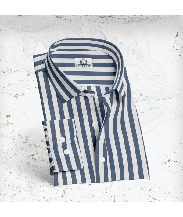 Chemise Larges Rayures Bleu Blanc sur mesure confectionnées à l’aide des meilleurs tissus italiens, selon la grande tradition de confection. Qualité, luxe et une longue tradition. La marque anglaise Thomas Mason naît en 1796, en pleine révolution industrielle, lorsque sir Thomas Mason, devinant les potentialités de cette période, crée à Leeds l’une des premières usines de tissus en coton pour chemises. Depuis lors, les tissus Thomas Mason sont une référence pour les passionnés du goût britannique et pour les amateurs des fils les plus fins, tirés des lins et des cotons les plus précieux au monde. Après deux cent ans de succès, en 1992, Thomas Mason est rachetée par la famille Albini de Bergame et elle intègre alors la grande tradition textile italienne. Découvrez nos collections En ce qui concerne la confection, nous avons plusieurs ateliers en fonction de votre recherche de style, de finitions, de budget et de délai. Nous vous conseillerons pour que vous ayez une chemise qui corresponde à vos souhaits. Nous travaillons avec les meilleurs artisans français, italiens ou d'Europe de l'Est.Le sur-mesure vous offre la possibilité de jouer avec tous ces paramètres. Cette Chemise Larges Rayures Bleu Blanc est entièrement personnalisable. Toutes les possibilités de finitions que nous vous proposons n'ont qu'un objectif : que votre vêtement corresponde à 100% à votre style, à votre image et à votre façon de vivre. Votre conseiller-tailleur vous accompagne pour vous permettre de concrétiser votre vêtement. Costume Privé Paris vous propose un service tailleur de réalisation de costumes sur-mesure digne des grandes maisons de luxe. Associant une qualité remarquable des tissus, une fabrication respectueuse de la tradition, un conseil passionné et exigeant et enfin une service personnalisé qui vous fait changer votre perception du shopping. Le sur-mesure est avant tout un art de vivre, c'est notre philosophie. La qualité remarquable des tissus est garantie par la collaboration avec les plus grands drapiers internationaux tels Loro Piana, Holland & Sherry, Scabal et Dormeuil. La confection n'est pas en reste. A quoi servirait l'avoir une Ferrari sur le châssis d'une Simca? L'atelier a été sélectionné avec soin pour garantir la meilleure tenue de votre vêtement sur-mesure dans le temps et le respect des délais de production. Cet atelier confectionne des marques prestigieuses, telles que Givenchy, Kenzo et Dormeuil Sur-Mesure. Le type de montage que j'ai retenu pour les collections business est un montage semi-traditionnel. Il respecte le savoir-faire et est un très bon compromis entre excellente tenue et cout raisonnable. Pour les puristes, il est aussi possible de choisir un entoilage total, ou alors un style casual sans entoilage pour des blazers-chemises très italiens. La coupe est enfin un critère clé pour votre style. Je n'ai pas de dictat car chacune fait du sens en fonction de votre morphologie et de l'esprit que vous voulez transmettre. Qu'elle soit anglaise, romaine ou napolitaine, votre épaule s'inscrit dans votre personnalité. Au même titre que l'ajustement d'une taille, d'une manche ou d'une cuisse. Que le choix du type de padding pour votre épaulette. Si vous avez des exigences particulières, je serai ravi de m'y conformer. Enfin le service d'exception qui vous fait oublier que vous faites du shopping. Vous êtes très occupés, les déplacements dans Paris sont fastidieux, le week-end vous avez mieux à faire que courir les boutiques. Nous venons à vous. Au bureau ou à domicile, nous nous déplaçons pour que vous sélectionniez vos tissus, pour prendre vos mesures ou pour réaliser votre essayage. Nous vous livrons vos vêtements sur le lieu de votre choix. Vous n'avez pas la possibilité de nous accueillir, rencontrons nous dans l'un de nos showrooms parisiens. Vous ne savez pas où faire entretenir vos costumes? Grâce à notre Groom Service, nous passons récupérer vos vêtements. 3 jours plus tard ils vous reviennent. L'art de vivre en sur-mesure. Chemise Larges Rayures Bleu Blanc