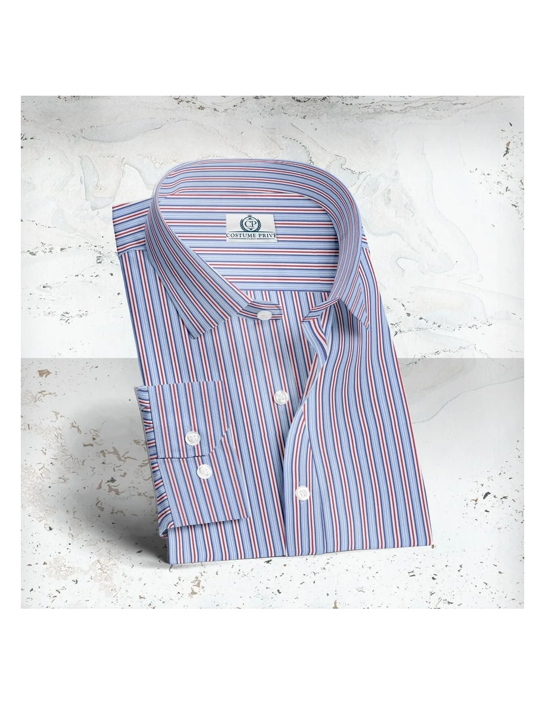 Chemise Larges Rayures Bleu Rouge sur mesure confectionnée à l’aide des meilleurs tissus italiens, selon la grande tradition de confection. Qualité, luxe et une longue tradition. La marque anglaise Thomas Mason naît en 1796, en pleine révolution industrielle, lorsque sir Thomas Mason, devinant les potentialités de cette période, crée à Leeds l’une des premières usines de tissus en coton pour chemises. Depuis lors, les tissus Thomas Mason sont une référence pour les passionnés du goût britannique et pour les amateurs des fils les plus fins, tirés des lins et des cotons les plus précieux au monde. Après deux cent ans de succès, en 1992, Thomas Mason est rachetée par la famille Albini de Bergame et elle intègre alors la grande tradition textile italienne. Découvrez nos collections En ce qui concerne la confection, nous avons plusieurs ateliers en fonction de votre recherche de style, de finitions, de budget et de délai. Nous vous conseillerons pour que vous ayez une chemise qui corresponde à vos souhaits. Nous travaillons avec les meilleurs artisans français, italiens ou d'Europe de l'Est.Le sur-mesure vous offre la possibilité de jouer avec tous ces paramètres. Cette Chemise Larges Rayures Bleu Rouge est entièrement personnalisable. Toutes les possibilités de finitions que nous vous proposons n'ont qu'un objectif : que votre vêtement corresponde à 100% à votre style, à votre image et à votre façon de vivre. Votre conseiller-tailleur vous accompagne pour vous permettre de concrétiser votre vêtement. Costume Privé Paris vous propose un service tailleur de réalisation de costumes sur-mesure digne des grandes maisons de luxe. Associant une qualité remarquable des tissus, une fabrication respectueuse de la tradition, un conseil passionné et exigeant et enfin une service personnalisé qui vous fait changer votre perception du shopping. Le sur-mesure est avant tout un art de vivre, c'est notre philosophie. La qualité remarquable des tissus est garantie par la collaboration avec les plus grands drapiers internationaux tels Loro Piana, Holland & Sherry, Scabal et Dormeuil, et Thomas Mason pour les tissus de chemise La confection n'est pas en reste. A quoi servirait l'avoir une Ferrari sur le châssis d'une Simca? L'atelier a été sélectionné avec soin pour garantir la meilleure tenue de votre vêtement sur-mesure dans le temps et le respect des délais de production. Cet atelier confectionne des marques prestigieuses, telles que Givenchy, Kenzo et Dormeuil Sur-Mesure. Le type de montage que j'ai retenu pour les collections business est un montage semi-traditionnel. Il respecte le savoir-faire et est un très bon compromis entre excellente tenue et cout raisonnable. Pour les puristes, il est aussi possible de choisir un entoilage total, ou alors un style casual sans entoilage pour des blazers-chemises très italiens. La coupe est enfin un critère clé pour votre style. Je n'ai pas de dictat car chacune fait du sens en fonction de votre morphologie et de l'esprit que vous voulez transmettre. Qu'elle soit anglaise, romaine ou napolitaine, votre épaule s'inscrit dans votre personnalité. Au même titre que l'ajustement d'une taille, d'une manche ou d'une cuisse. Que le choix du type de padding pour votre épaulette. Si vous avez des exigences particulières, je serai ravi de m'y conformer. Enfin le service d'exception qui vous fait oublier que vous faites du shopping. Vous êtes très occupés, les déplacements dans Paris sont fastidieux, le week-end vous avez mieux à faire que courir les boutiques. Nous venons à vous. Au bureau ou à domicile, nous nous déplaçons pour que vous sélectionniez vos tissus, pour prendre vos mesures ou pour réaliser votre essayage. Nous vous livrons vos vêtements sur le lieu de votre choix. Vous n'avez pas la possibilité de nous accueillir, rencontrons nous dans l'un de nos showrooms parisiens. Vous ne savez pas où faire entretenir vos costumes? Grâce à notre Groom Service, nous passons récupérer vos vêtements. 3 jours plus tard ils vous reviennent. L'art de vivre en sur-mesure. Chemise Larges Rayures Bleu Rouge