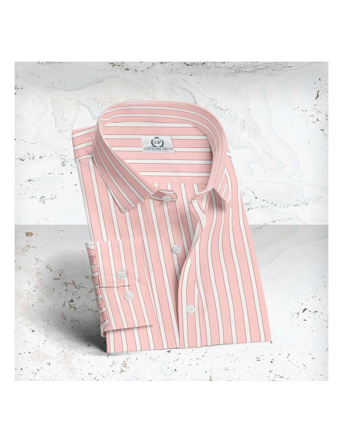 Chemise rose à rayures blanches. Tissu Thomas Mason Personnalisez votre chemise sur-mesure : 25 cols 8 poignets 9 modèles de poche Broderie Boutons Surpicures ...