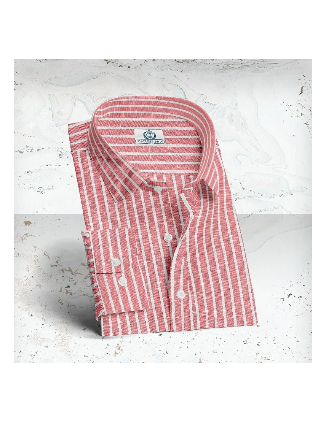 Chemise rouge à rayures blanches. Tissu Thomas Mason Personnalisez votre chemise sur-mesure : 25 cols 8 poignets 9 modèles de poche Broderie Boutons Surpicures ...