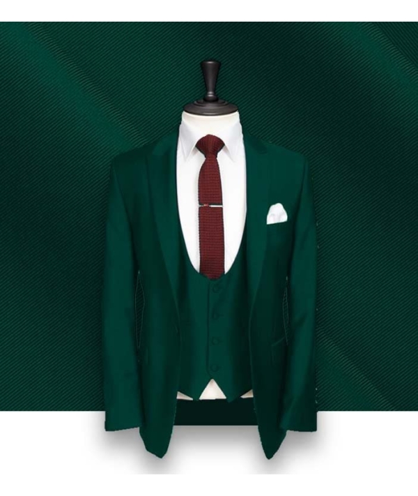 Costume mariage vert sapin esprit smoking revisité pour ce 3 pièces avec son gilet bas, Veste 1 bouton, poches à rabat Boutons recouverts de tissu pour une élégance cérémonie, inspirée du smoking.