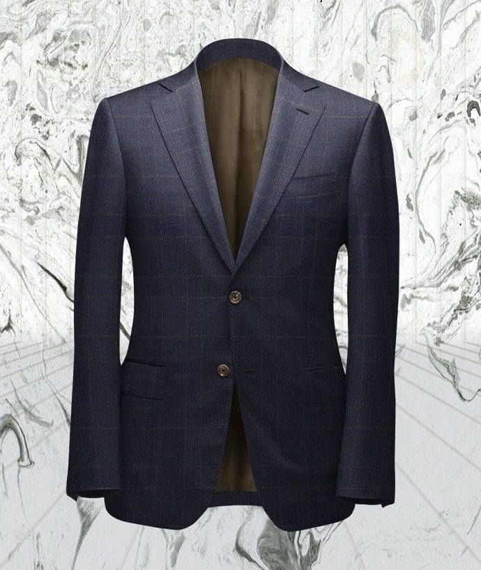 Un classique dandy revisité avec subtilité et finesse. Ce Costume bleu avec carreaux fenêtre marron vous apporte style et distinction. Flanelle très légère et confortable. Super 110's. 2 boutons. Coupe droite, revers à cran, 2 poches droites à rabat.
