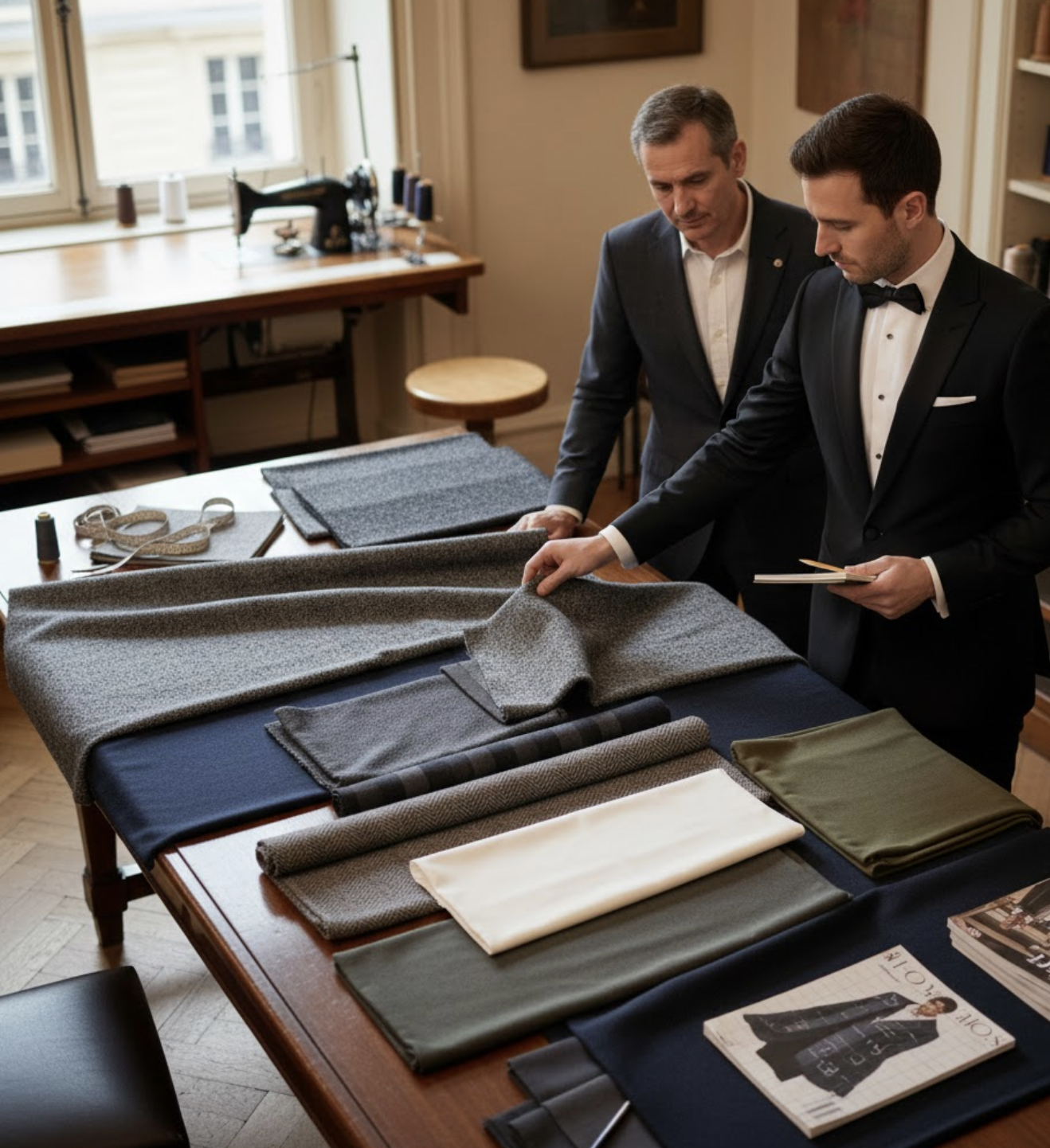 Notre atelier propose plus de 200 tissus soigneusement sélectionnés, permettant de créer le costume parfait pour chaque usage et chaque saison.