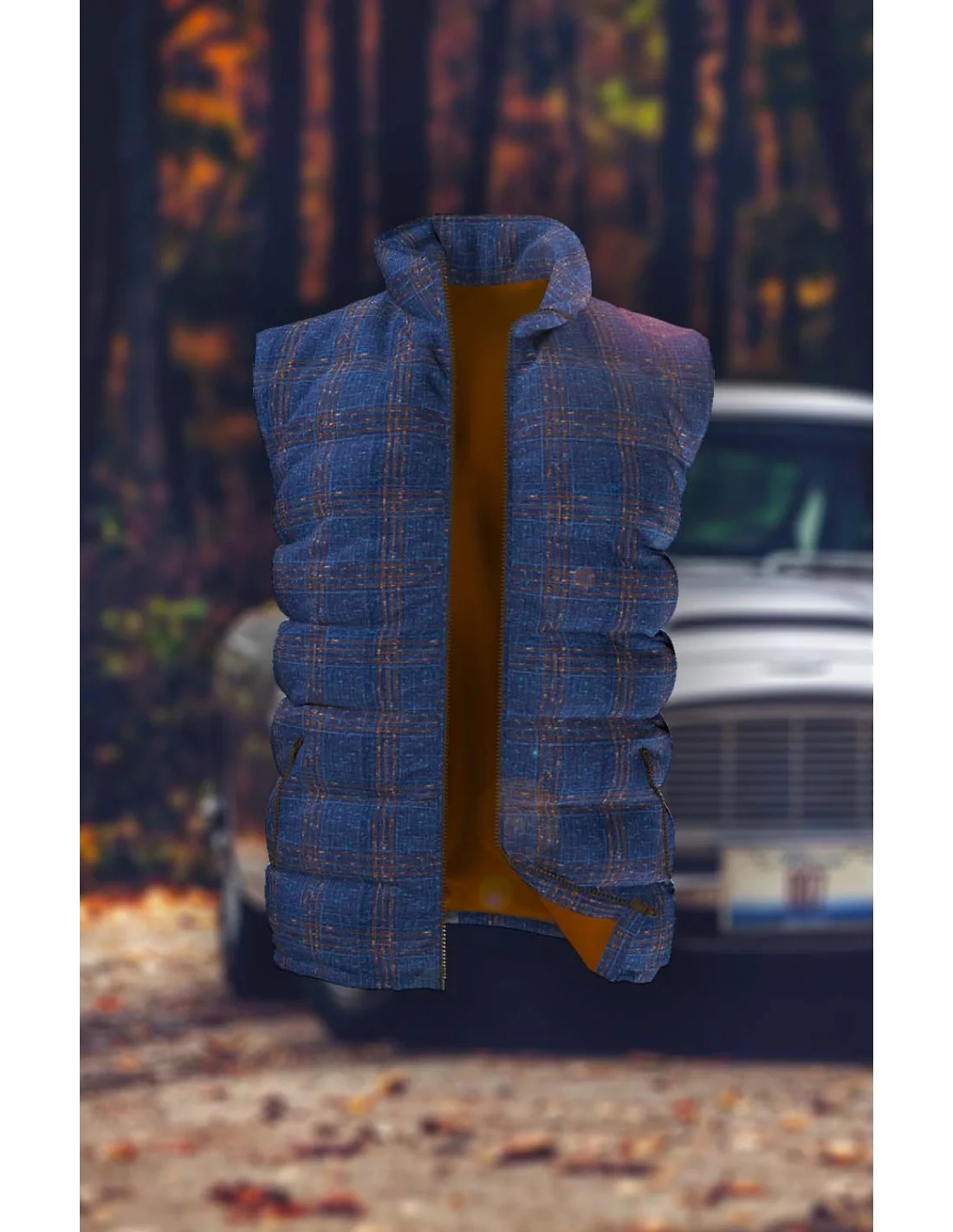 Doudoune bleu carreaux orange matelassée sur-mesure pour homme