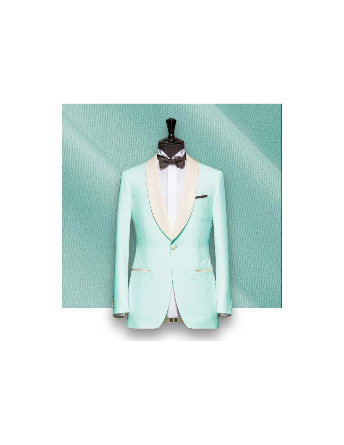 Le Smoking bleu céladon col châle sur mesure, pour réinventer la tradition lors de votre mariage col revers châle contrasté en satin crème Poches passepoilées, 1 bouton satin