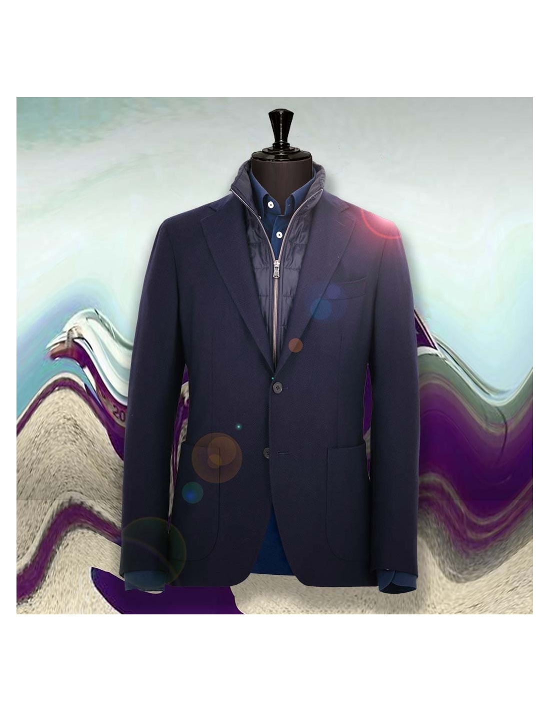 Cette veste bleu à plastron amovible répond à une exigence précise : porter un manteau à la finition soignée, proche d'un blazer, sans sacrifier la praticité par temps froid. Conçue sur-mesure pour homme, elle s'inscrit dans la collection automne-hiver dédiée aux silhouettes classiques et structurées.