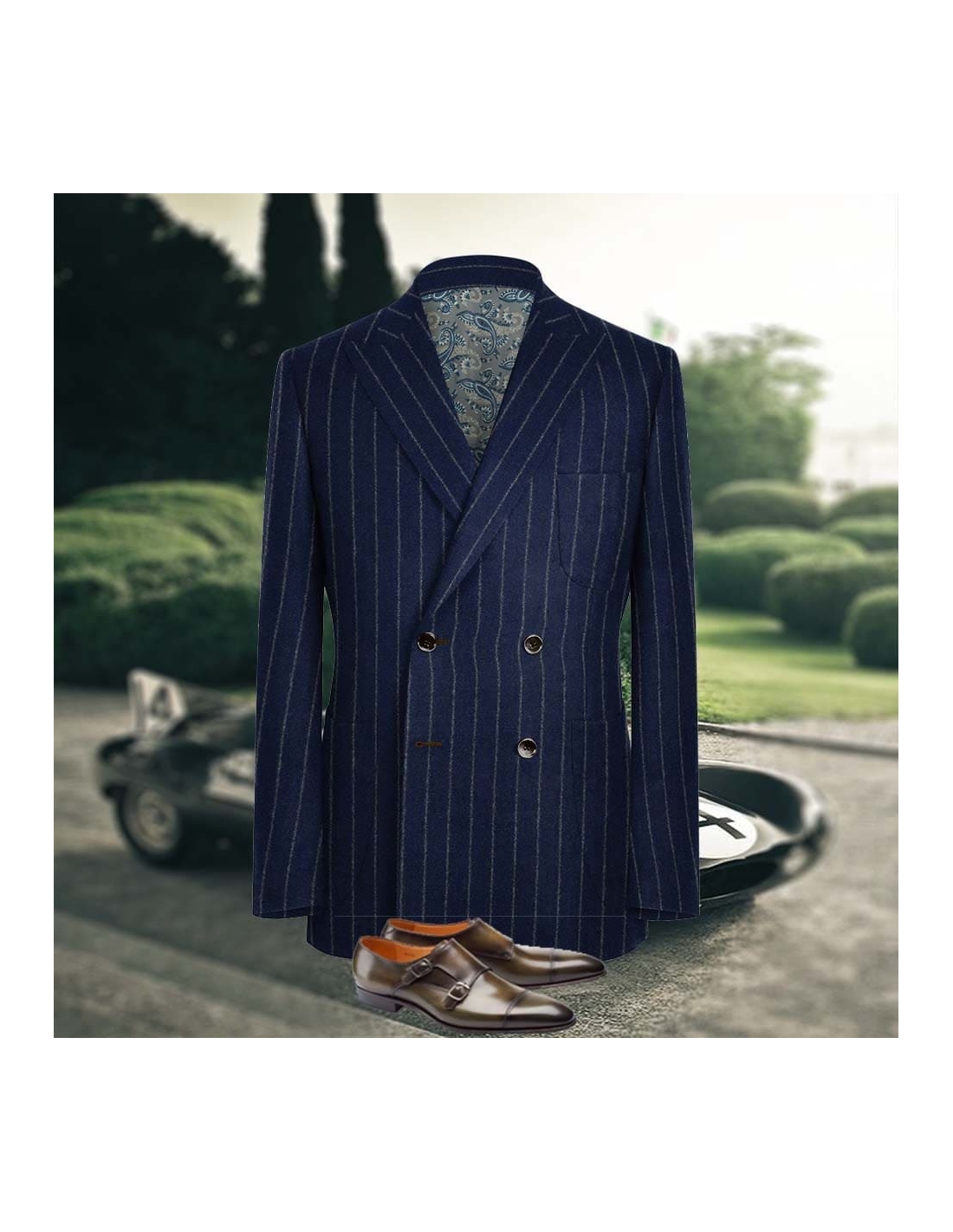 Veste croisée bleu rayures gris pour un style intemporel Tissu pure laine Solbiati 4 boutons Coupe croisée, col revers à cran pointu, 3 poches appliquées Sneakers personnalisés patinés main 220€ sur demande.