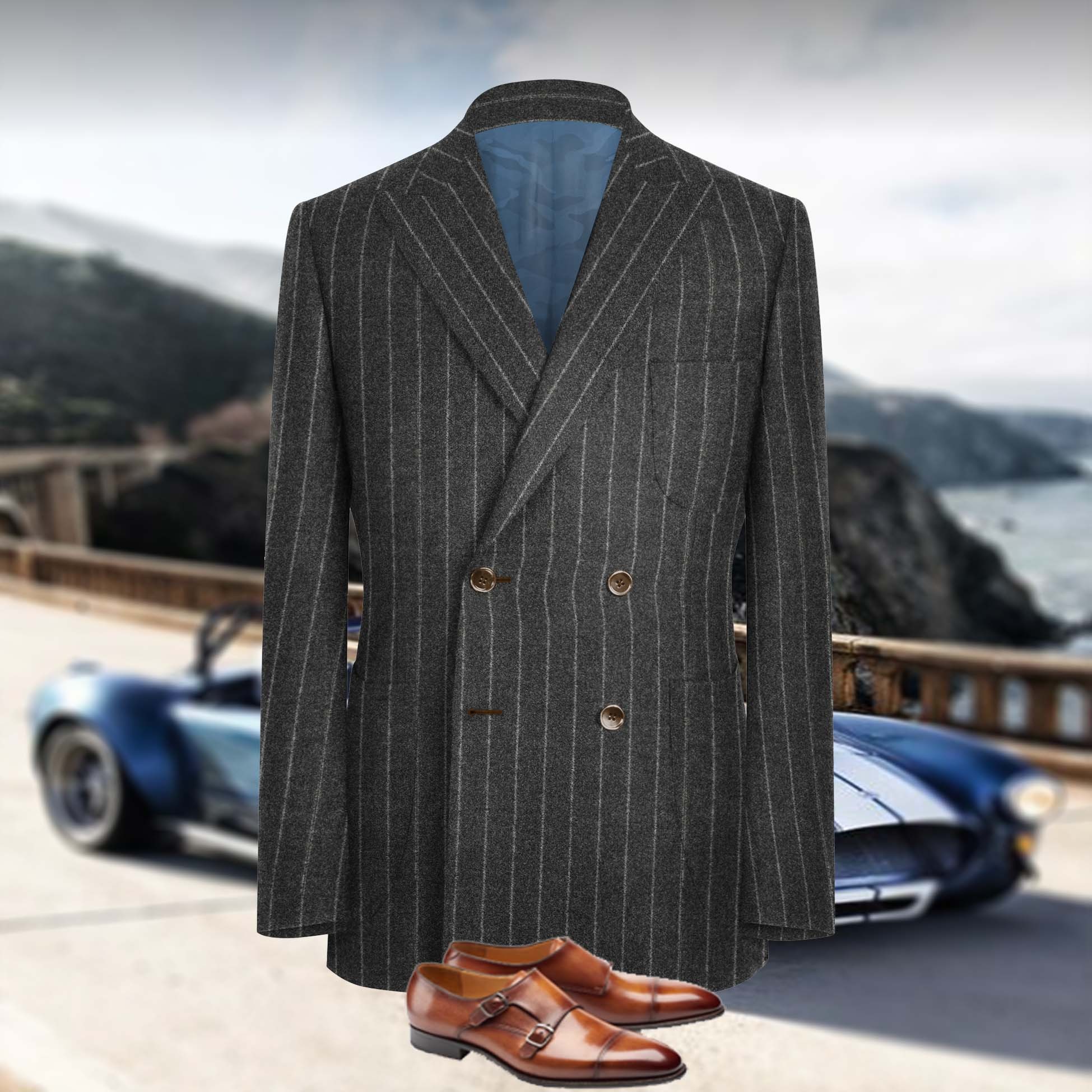 Veste croisée gris rayures gris pour un style intemporel Tissu pure laine Solbiati 4 boutons Coupe croisée, col revers à cran pointu, 3 poches appliquées Sneakers personnalisés patinés main 220€ sur demande.
