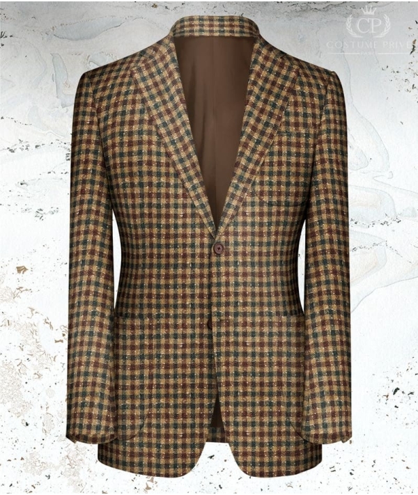 Cette Veste marron tweed carreaux est réalisée en sur-mesure, d'autres styles sont disponibles sur les recommandations de votre conseiller tailleur : Coupe : croisée Finition : poches droites ou en biais, revers en pointe Boutons : contrastésLe style casual chic prend tout son sens grâce aux jeux des contrastes. Couleurs, matières, finitions, le champs des possibles s'élargit. Le sur-mesure vous offre la possibilité de jouer avec tous ces paramètres. Cette Veste marron clair large carreau est entièrement personnalisable. Toutes les possibilités de finitions que nous vous proposons n'ont qu'un objectif : que votre vêtement corresponde à 100% à votre style, à votre image et à votre façon de vivre. Votre conseiller-tailleur vous accompagne pour vous permettre de concrétiser votre vêtement. Les conseils Bonne Gueule Costume Privé Paris vous propose un service de réalisation de costumes sur-mesure digne des grandes maisons de luxe. Associant une qualité remarquable des tissus, une fabrication respectueuse de la tradition, un conseil passionné et exigeant et enfin une service personnalisé qui vous fait changer votre perception du shopping. Le sur-mesure est avant tout un art de vivre, c'est notre philosophie. La qualité remarquable des tissus est garantie par la collaboration avec les plus grands drapiers internationaux tels Loro Piana, Holland & Sherry, Scabal et Dormeuil. La confection n'est pas en reste. A quoi servirait l'avoir une Ferrari sur le châssis d'une Simca? L'atelier a été sélectionné avec soin pour garantir la meilleure tenue de votre vêtement sur-mesure dans le temps et le respect des délais de production. Cet atelier confectionne des marques prestigieuses, telles que Givenchy, Kenzo et Dormeuil Sur-Mesure. Le type de montage que j'ai retenu pour les collections business est un montage semi-traditionnel. Il respecte le savoir-faire et est un très bon compromis entre excellente tenue et cout raisonnable. Pour les puristes, il est aussi possible de choisir un entoilage total, ou alors un style casual sans entoilage pour des blazers-chemises très italiens. La coupe est enfin un critère clé pour votre style. Je n'ai pas de dictat car chacune fait du sens en fonction de votre morphologie et de l'esprit que vous voulez transmettre. Qu'elle soit anglaise, romaine ou napolitaine, votre épaule s'inscrit dans votre personnalité. Au même titre que l'ajustement d'une taille, d'une manche ou d'une cuisse. Que le choix du type de padding pour votre épaulette. Si vous avez des exigences particulières, je serai ravi de m'y conformer. Enfin le service d'exception qui vous fait oublier que vous faites du shopping. Vous êtes très occupés, les déplacements dans Paris sont fastidieux, le week-end vous avez mieux à faire que courir les boutiques. Nous venons à vous. Au bureau ou à domicile, nous nous déplaçons pour que vous sélectionniez vos tissus, pour prendre vos mesures ou pour réaliser votre essayage. Nous vous livrons vos vêtements sur le lieu de votre choix. Vous n'avez pas la possibilité de nous accueillir, rencontrons nous dans l'un de nos showrooms parisiens. Vous ne savez pas où faire entretenir vos costumes? Grâce à notre Groom Service, nous passons récupérer vos vêtements. 3 jours plus tard ils vous reviennent. L'art de vivre en sur-mesure. Veste marron tweed carreaux Veste marron tweed carreaux