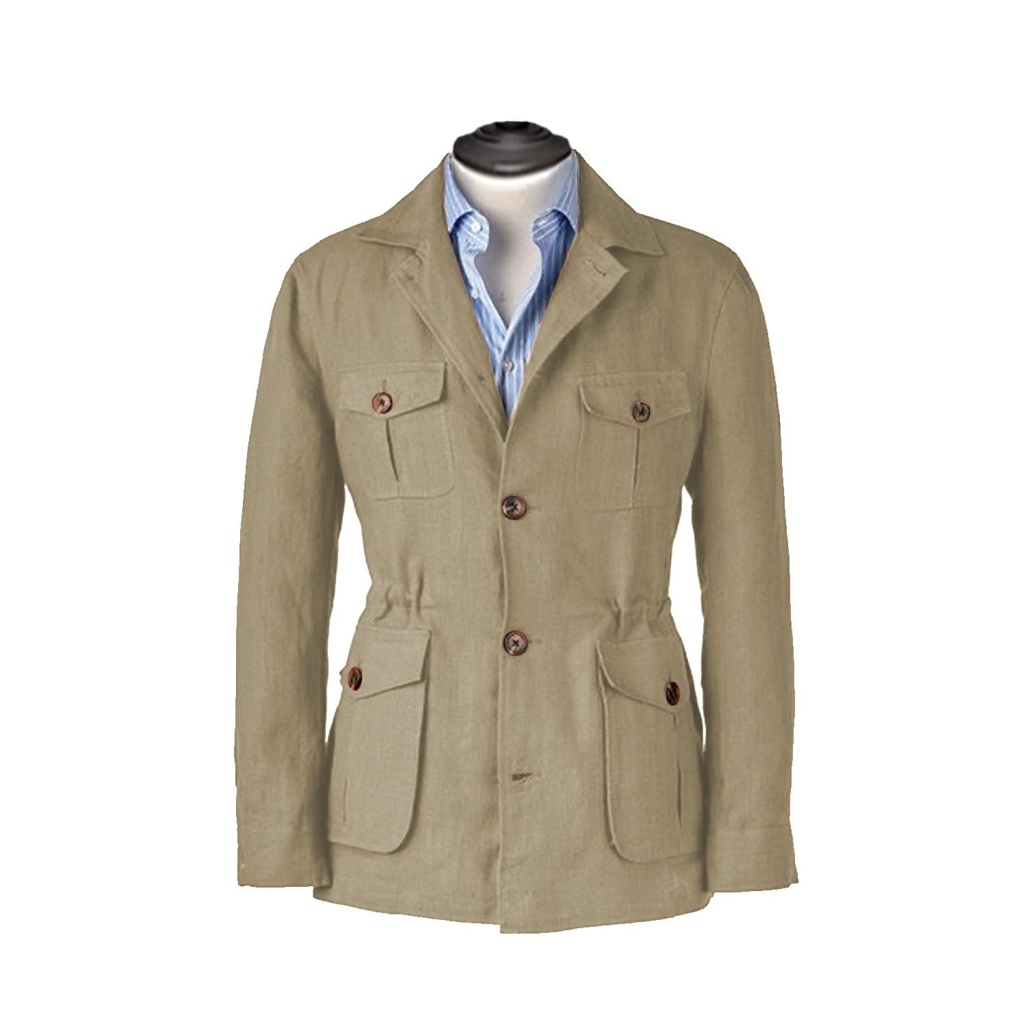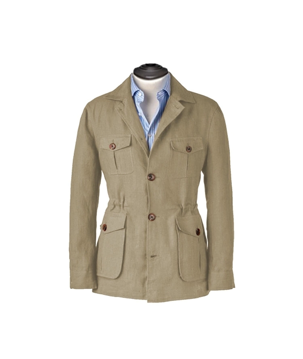 Veste saharienne lin beige sable Comme souvent dans la garde robe masculine, la veste saharienne lin beige sable n'échappe pas à ses origines militaires. Elle a été créée pour l'armée britannique des Indes. Elle était alors en lin ou en coton pour apporter des la fraicheur et praticité avec ses 4 poches boutonnées. Entre la chemise, la veste et le manteau, elle est très pratique pour rester élégant même par 40°C. Elle est naturellement reprise en Afrique comme veste lors des safari. Les anglo-saxons la nomme d'ailleurs "safari jacket". Elle a été popularisée par les media avec des photos d'Hemingway en Afrique, puis le cinéma dans les années 60. C'est Yves Saint Laurent qui la fera monter sur les podiums en lui apportant une touche féminine. Costume Privé Paris vous propose un modèle de veste saharienne sur mesure avec cintrage ceinture ou cordon élastique. Il confère un look aventurier urbain chic. Une veste qui ne laisse pas indifférent. Nous vous proposons aussi cette veste saharienne en cuir, nubuck ou veau velours pour un style intemporel en toutes saisons.